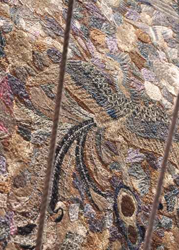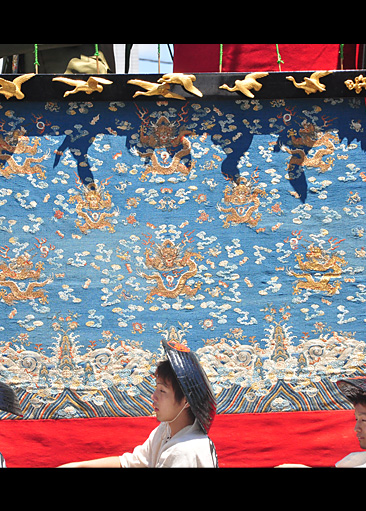 現在は前懸と見送に戦後活躍した日本画家・山口華陽の《凝視》(ライオン図)と《鶴図》、胴懸は江戸時代の尾形光琳の画《燕子花図》を原画とした織物を使用。他にも貴重な染織品を多く所蔵している。
