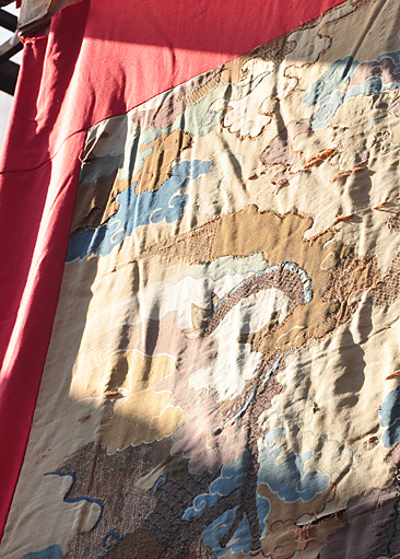 見送は、中国・明時代に織られた「金地唐美人図綴錦」(現在は復元品)と江戸時代前期の僧・袋中上人が請来したと伝わる中国の龍文軍旗で作った「龍図絽刺」の2種類で、1年交替で使用。掛け金具には黄道二十八宿の星座の図が描かれている。