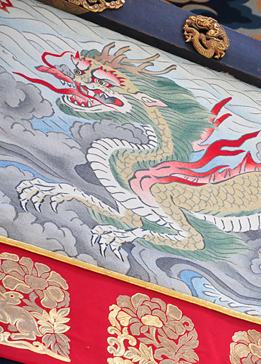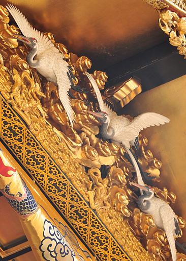 屋根下の破風正面にある三羽の丹頂鶴の彫り物は、明治時代に活躍した京都画壇初期の大家・幸野媒嶺の下絵による。水引は平成6年以降は高山寺所蔵の国宝「華厳宗祖師絵伝」で大きな船が龍の背にのって荒海を進むダイナミックな場面を下絵にした綴織を用いる。