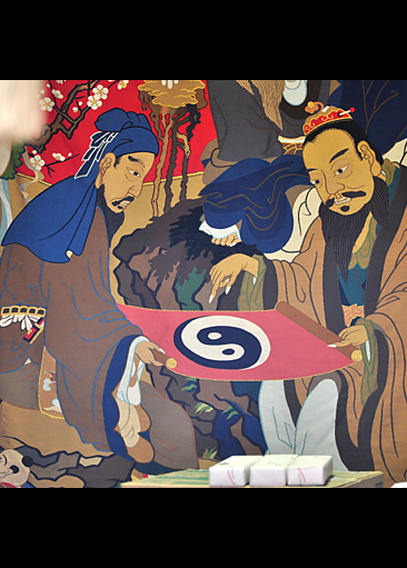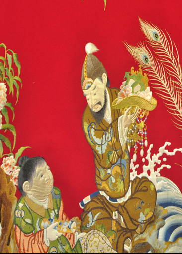 前懸・胴懸は円山応挙の下絵によるもの。水引はクジャクの羽を縫い込んだ刺繍の逸品である。