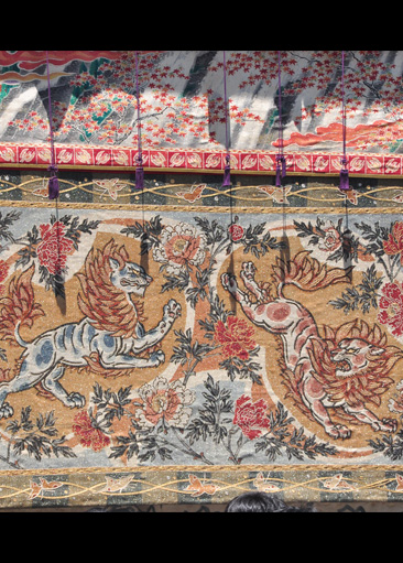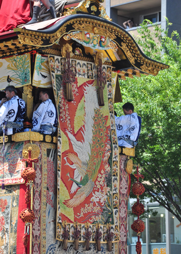 昭和に再建された比較的新しい鉾のため、懸装品も京都の染織家・皆川月華作の《唐獅子図》《飛鶴図》をはじめ、同じく染織家の山鹿清華、月華の弟子の皆川泰三ら、昭和以降に活躍した著名な作家が手がけているのが特徴。他の鉾と違い、屋根は曲線的な唐破風(からはふ)造りで屋根下の懸魚には鳳凰の彫物、軒下には翠簾(すいれん)と呼ばれるすだれを掲げる。
