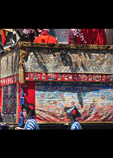 前掛は中国明代の皇帝・萬歴帝が即位時に身に着けたといわれる古錦を復元した五爪龍文様錦。五爪の龍は中国皇帝にだけ許されたともいう高貴な絵柄である。見送は牡丹双鳳凰文綴錦(2004年新調)とこれとは別に復元新調した宝散らし額唐子嬉遊図を用いる。