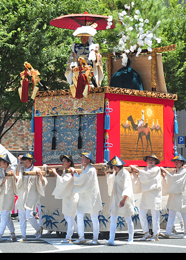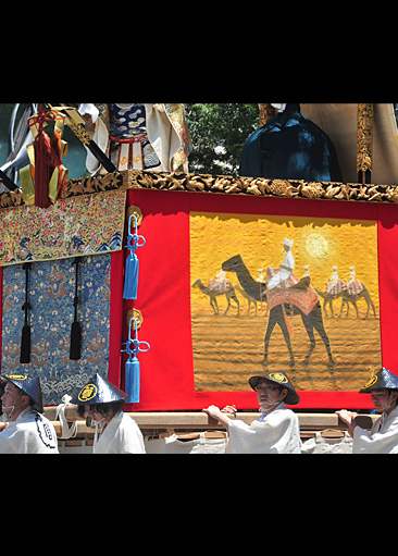 見送りは京都画壇の大家・竹内栖鳳の筆「白地墨画叢竹図」を下絵とした綴織。白地に力強い筆致で描かれた墨一色の竹林は、極彩色など華やかな飾りが多い山鉾の中ではかえって異彩を放っている。胴掛は近代日本画壇の巨匠・平山郁夫が下絵を手掛けた「砂漠らくだ行」。左右で昼を表す「日」と夜を表す「月」の対となっている。
