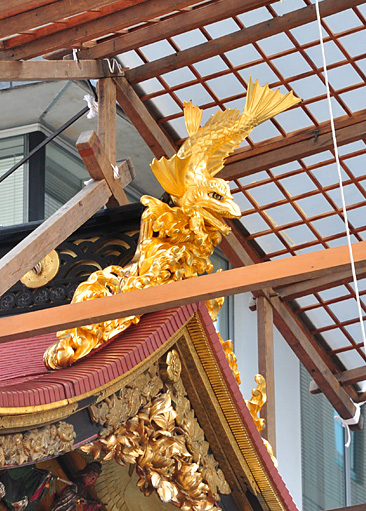 真木のなかほどの「天王座」には、鎌倉時代に鉾先の長刀を愛用したといわれる源氏の武将・和泉小次郎親衡(いずみこじろうちかひら)の人形が守護神として祀られている。また、破風には三条小鍛冶宗近が神剣を作る姿を表した彫刻が見られる。