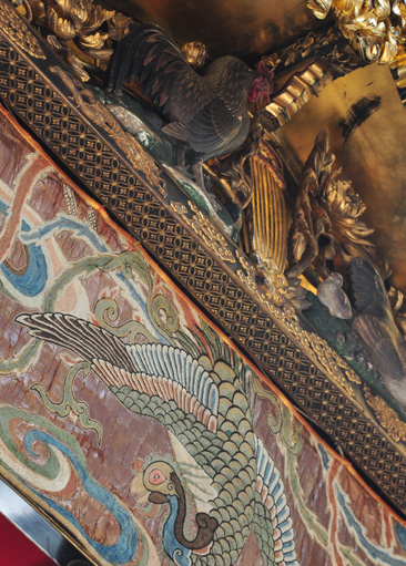 見送は江戸時代初期に輸入された16世紀ベルギー製のゴブラン織タペストリー(重要文化財)。古代ギリシャの長編叙事詩『イーリアス』に取材したものとされ、トロイア戦争時、トロイアの王子ヘクトールがギリシャ軍のアキレウスとの決闘に際し、妻子に別れを告げる場面が描かれている。水引は松村呉春(1752~1811)など四条派画家の下絵によるもの。その他、近年復元新調されたペルシャやインドの絨毯を懸物に用いる。