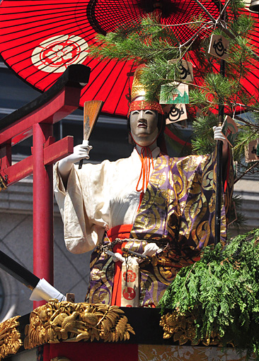 女性の姿をした鈴鹿権現像は大長刀を手に、立て烏帽子を被った姿が凛々しい。後ろの山には退治された赤熊で象徴された悪鬼の首が据えられる。鬼=盗賊のためか、巡行の後は真木の松に飾られた絵馬は「盗難除け」の御守りとして授与されている。