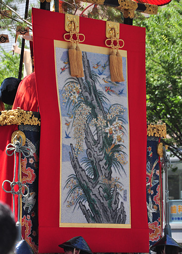 前懸は平成元年に新調された、駱駝の図「黄砂の道」。胴懸には日本画家・今井俊満氏原画の「桜図綴織」「紅葉図綴織」を用いる。見送は文化13年購入の中国明代の雲龍文様、天啓2年(1622)の年記を持つ紺紙金泥文字、明治35年作の牡丹鳳凰文様刺繍を伝えるが、現在は昭和57年新調の染彩ハワイの蘭花を用いている。欄縁金具は山鹿清華下絵の四季花鳥文様である。