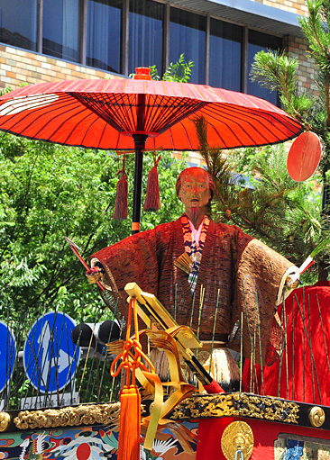 ご神体は等身大の老翁像で、腰蓑を身につけ、右手に鎌、左手に木賊を持つ。元禄5年(1692)の墨署名が残り、頭は仏師・春日の作といわれる。水引は日輪鳳凰文様の綴錦及び道釈人物刺繍、前懸は唐人交易図刺繍、左右の胴懸は平成11~13年に復元新調した中国故事人物図の綴織、見送は中国明代の牡丹双鳳文様綴錦となっている。また、角金具は木賊と銀兎文様で、こちらは山の題材になぞらえたもの。
