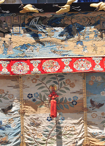 正面の水引は中国からもたらされた雲中の竜、青海波と麒麟を精緻な刺繍で描いた豪華なもの。見送りの「龍波濤文様綴錦」は現在は復元新調したものを使用するが、オリジナルは中国・明時代のものとされる。
